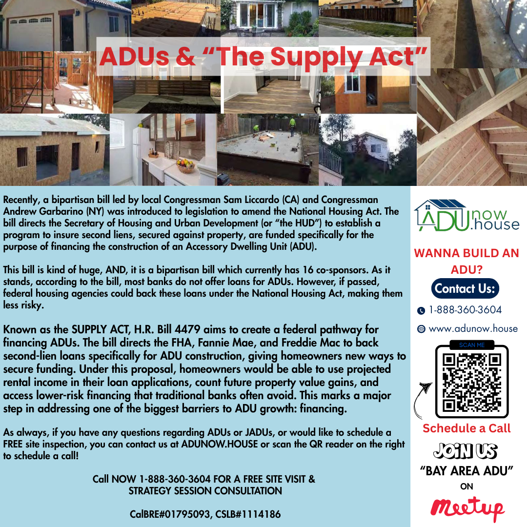 Known as the SUPPLY ACT, H.R. Bill 4479 aims to create a federal pathway for financing ADUs. The bill directs the FHA, Fannie Mae, and Freddie Mac to back second-lien loans specifically for ADU construction, giving homeowners new ways to secure funding. Under this proposal, homeowners would be able to use projected rental income in their loan applications, count future property value gains, and access lower-risk financing that traditional banks often avoid. This marks a major step in addressing one of the biggest barriers to ADU growth: financing.